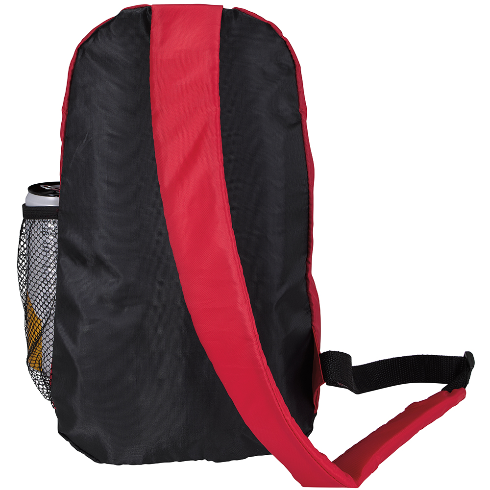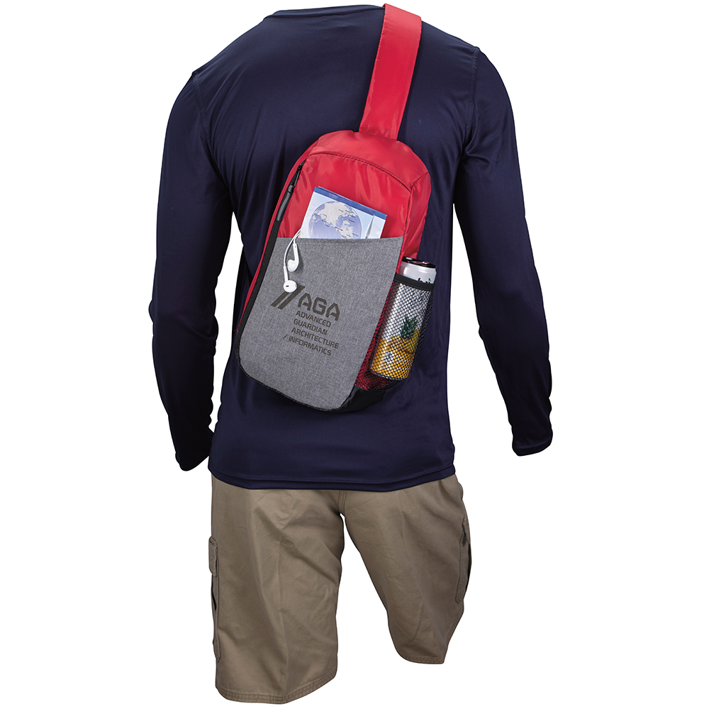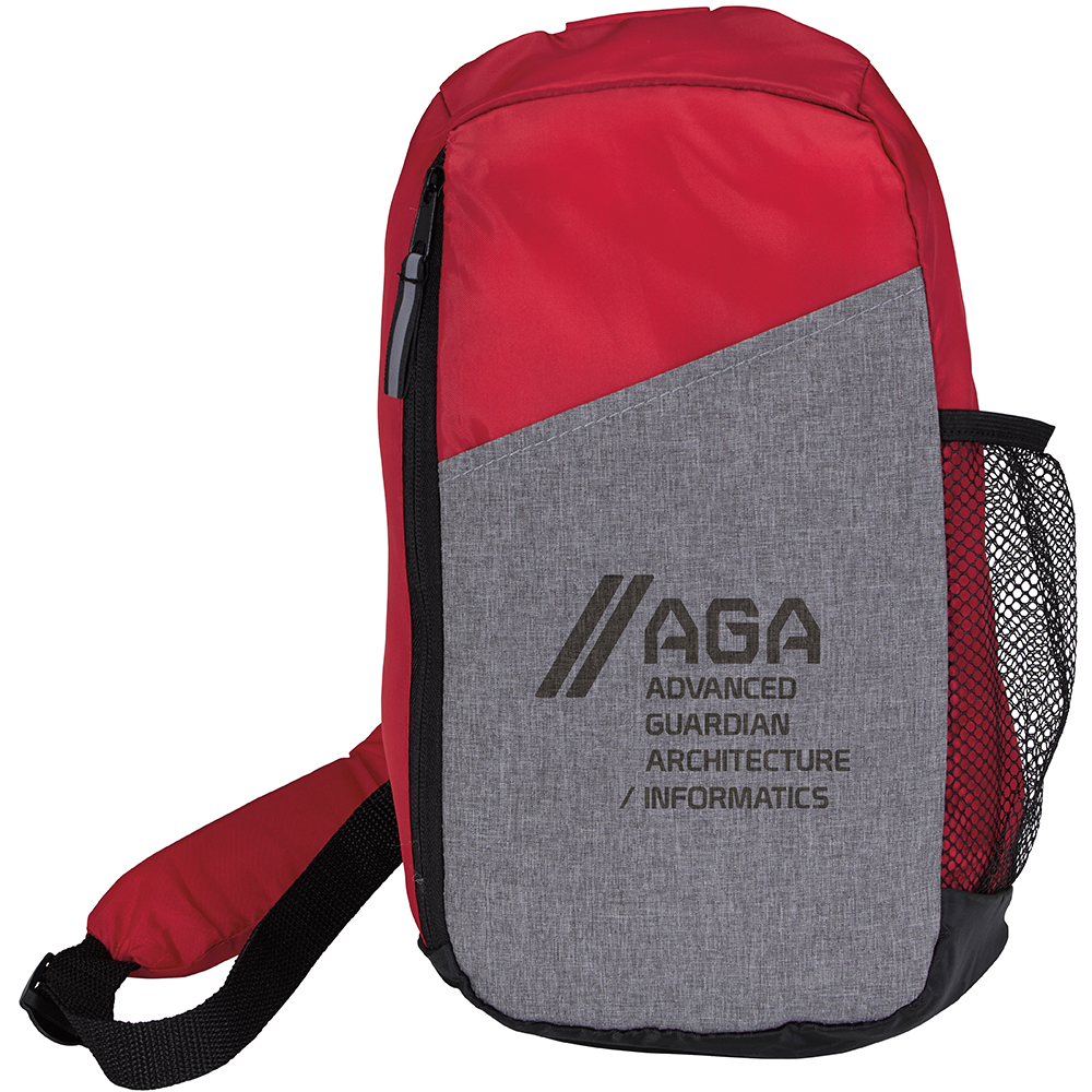 This sport slingpack is great to hold your essentials while at the gym or on-the-go. Main zippered compartment. Front slip pocket. Padded adjustable shoulder strap. Side mesh pocket. PRODUCT MATERIALS: 210D Polyester.