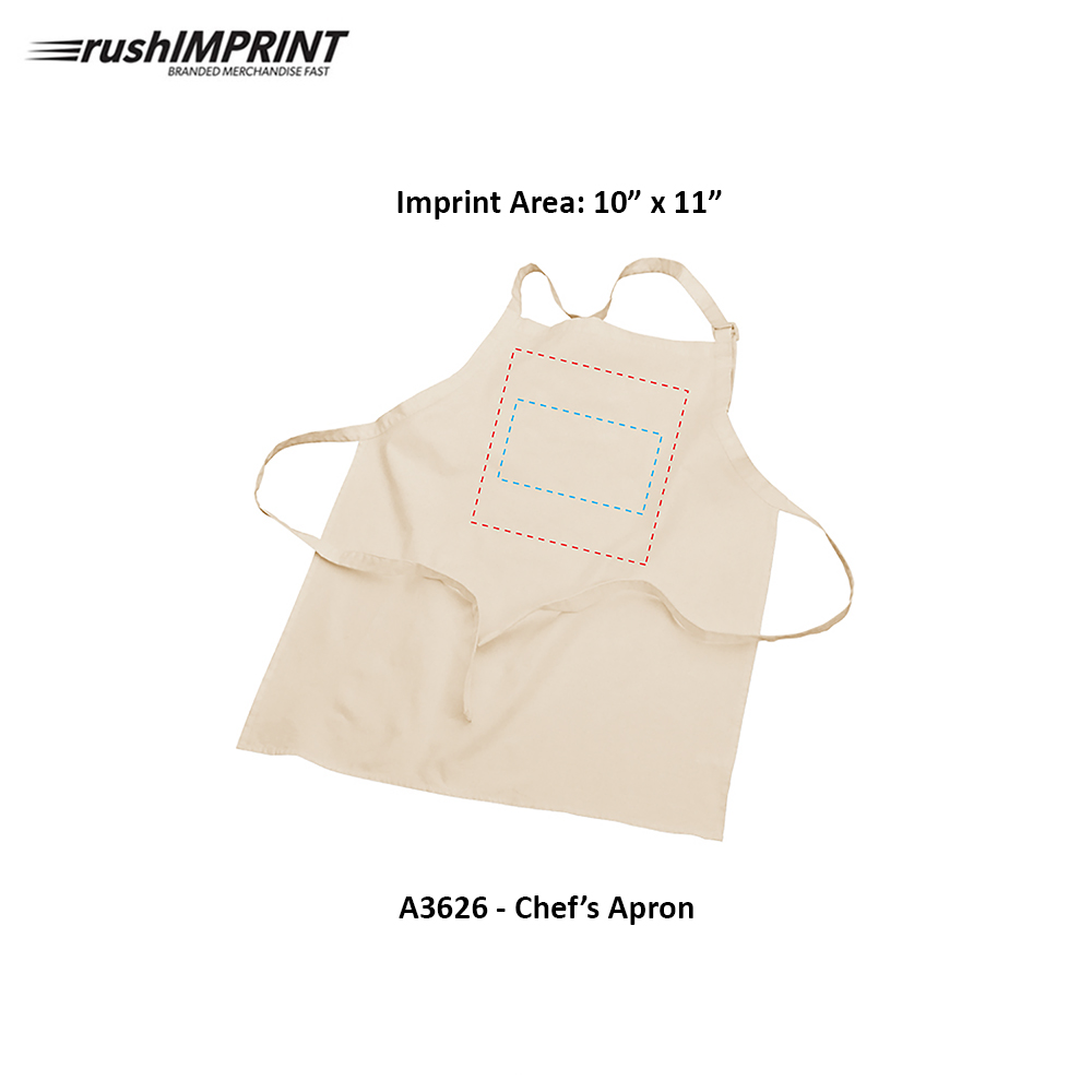 Poly Cotton 65/35. Washable (direct screen print only); non-washable for any other decorating methods. Extra long self-material waist ties. 100% Natural cotton processed AZO-Free, with no hazardous chemicals. Price includes one colour, one location imprint.