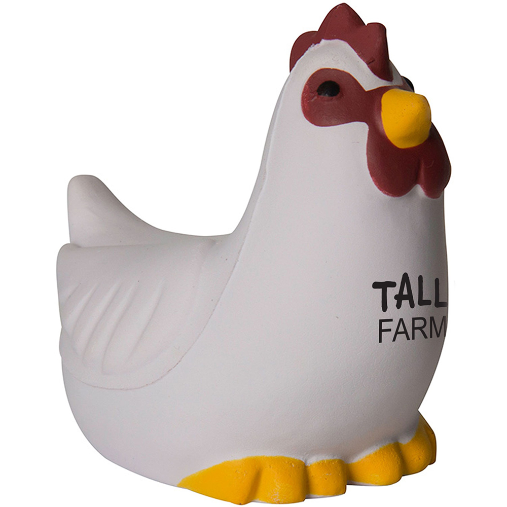 Custom stress ball - 3.5" x 3.5"- 0.1 lbs. shaped like a chicken in white colour. A minimum of 150 personalized in 7 days of production. A stress reliever and a promotional tool rolled into one. Imprint dimensions: 0.75" x 0.5". Price includes one colour imprint. Free art proof will be emailed with every order within one business day. No duties, no fees!