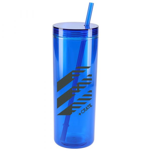 The Chroma Recycled Acrylic Straw Tumbler 16oz is an on-trend and eco-friendly option at an amazing value. Made from 100% recycled SAN and includes a 100% recycled PP straw which is notched to help prevent the straw from getting lost. Features double wall construction to reduce condensation and help prevent drips onto tables and countertops. This acrylic tumbler is perfect for traveling, the outdoors, and at home. Hand wash only. 16oz. Crafted from 100% recycled SAN. Notched 100% recycled PP straw so it doesn't get lost. Double-wall construction minimizes condensation and drips on surfaces. Price includes one colour, one location imprint.