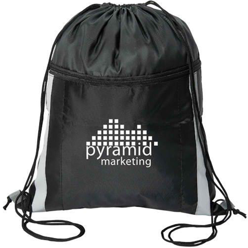 Lightweight 210D Polyester. Rope drawstring closure to cinch the bag and use as backpack straps. Front zippered pocket. Vertical silver reflective stripes on the front pocket.Reflective stripes help increase your visibility. Price includes one colour, one location imprint.