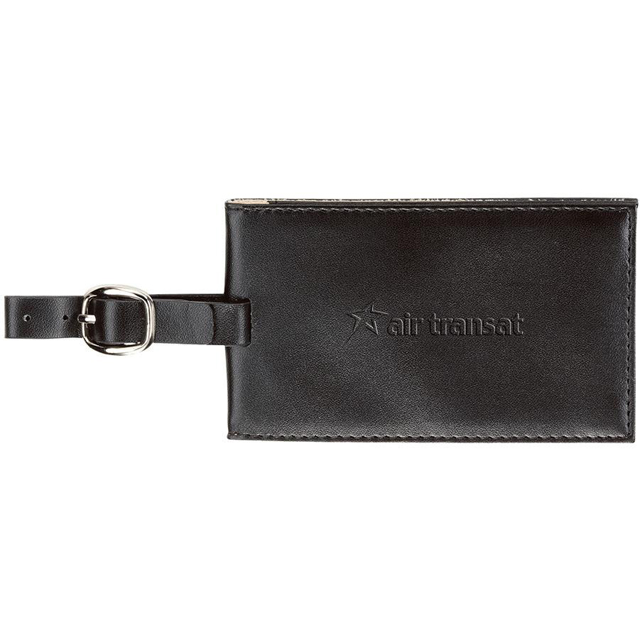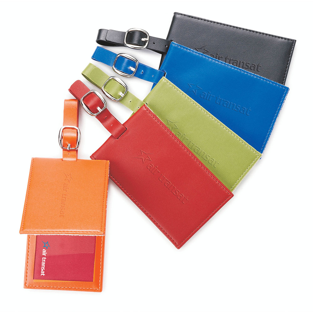 Colourplay leather luggage tag with hidden magnetic closure. Holds standard business card. Price includes debossing.