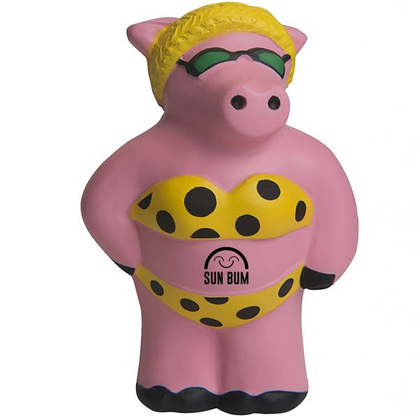 Custom stress ball - 3"x 4.75"- 0.1 lbs - in pink colour. A stress reliever shaped like a standing pig wearing a two-piece suit and a headband. A cool and fun way to promote your brand and relieve your stress away! Imprint dimensions: 1" x 0.5". Price includes one colour imprint. Free art proof will be emailed with every order within one business day. A minimum of 150 personalized stress balls in 7 days of production. No hidden fees!
