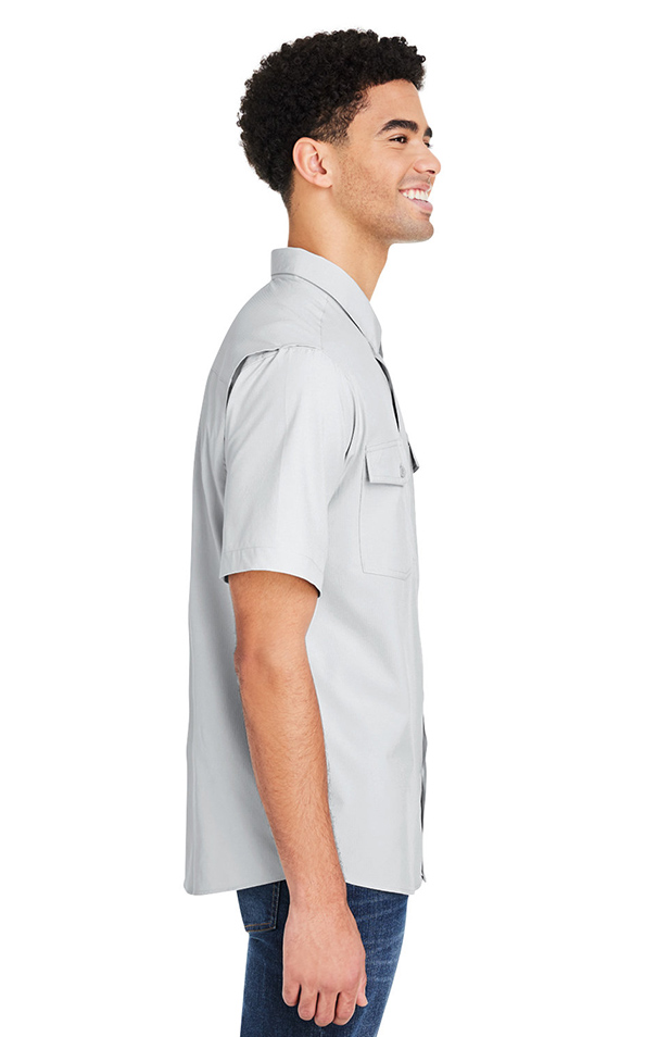 Fabric: Body: 4 oz/yd2 / 147 gsm, 88% polyester, 12% spandex ripstop. Lining: 100% polyester mesh Lining in upper back. Ultra UVP technology creates superior UPF 50+ sun protection with quick dry performance. Feature: Self-fabric collar with integrated collar stays. Tear away label. Price includes embroidery.