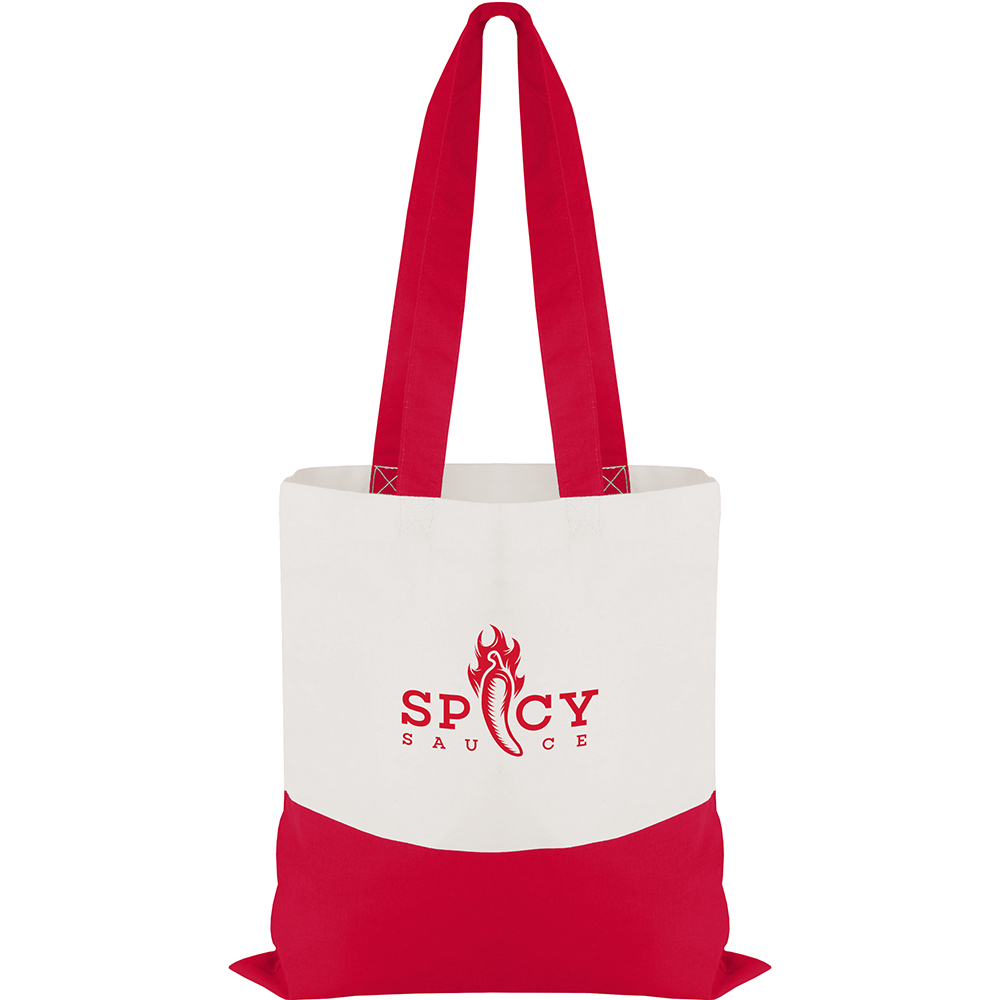 This cotton sheeting tote will turn heads with its two-tone design and colored handles, available in several bright and upbeat color options. The sturdy elongated 26" self handles on this reusable bag are a nice length for carrying comfortably over your shoulder while you run errands, shop the stalls at the farmers market, or make your weekly trip to the library. Sturdy elongated self handles that finish at 26" long. 4 oz. Cotton. Price includes one colour, one location imprint.