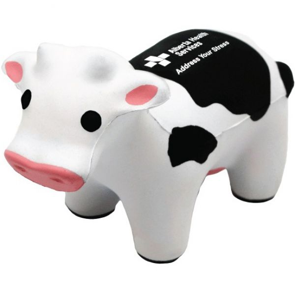 Custom stress ball - 3.5" x 4.5"- 0.1 lbs in a cow shape. In black/white colour combinations. An ideal promotional tool for your brand. Squeezable foam in polyurethane material. Imprint dimensions: 1.5" x 1". Price includes one colour imprint. A minimum of 150 personalized stress balls. Free art proof will be emailed with every order within one business day. No hidden fees!