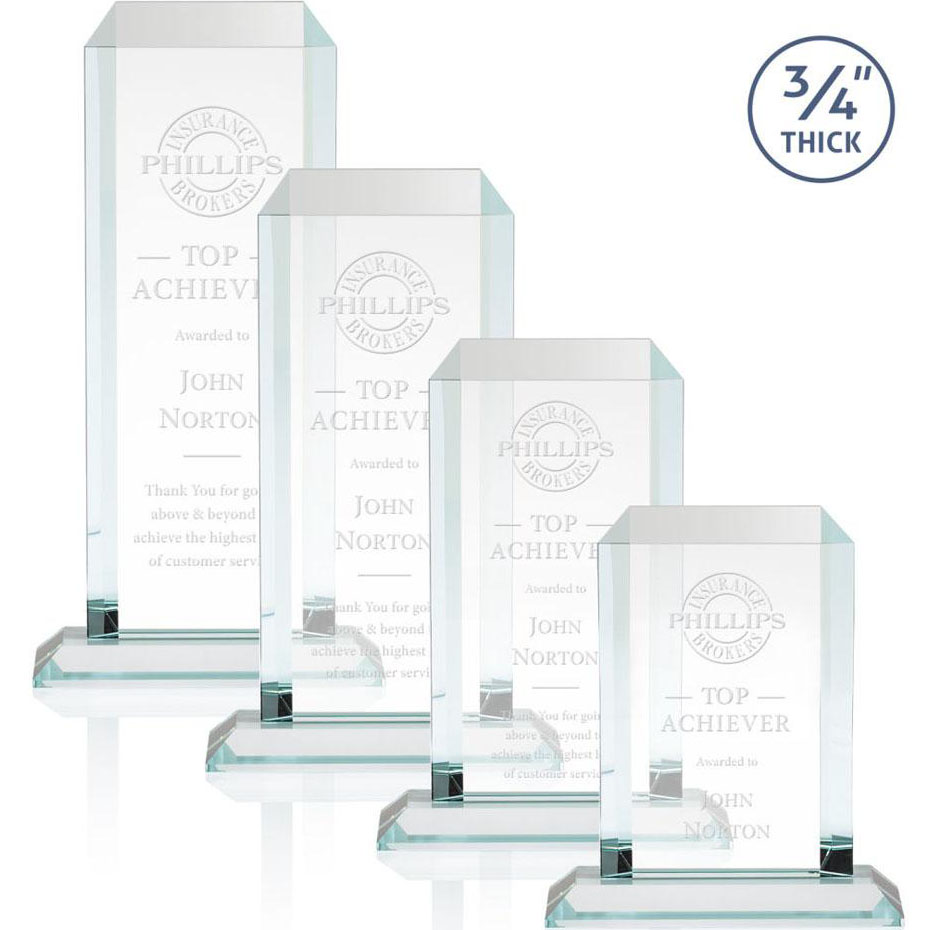 The Dalton Starfire Crystal Award features a thick 3/4" tower with mitered edges all around that create a sparkling frame for your message of recognition. Available with your choice of 8 distinct and vivid colored bases, the Dalton award radiates light throughout the room and showcases your special achievement. Price includes laser engraving.
