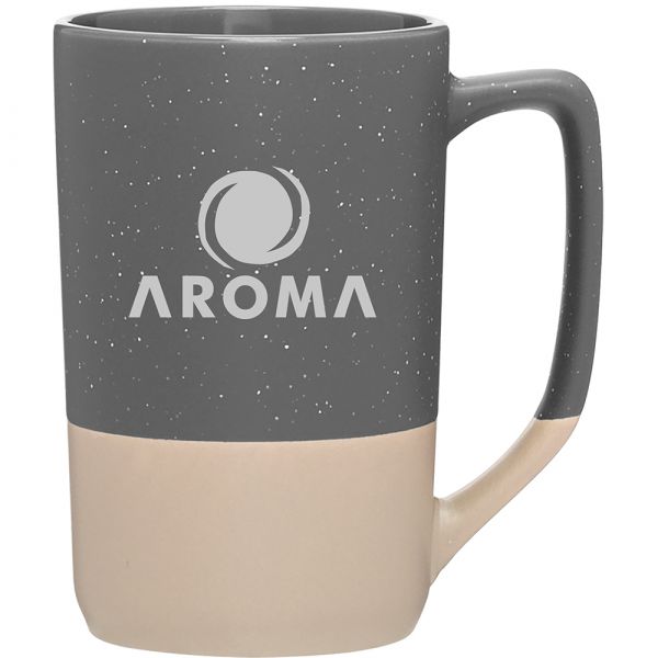 17 oz ceramic mug with matte colored exterior, glossy colored interior, glazed base, and speckles
