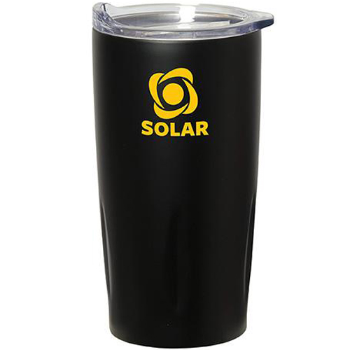 Stainless Steel interior and exterior. Double walled with vacuum insulation to keep your drink hot or cold longer. Glossy dimple designed exterior. Clear Acrylic snap-on lid with Plastic sliding closure. For use with hot and cold beverages. Holds up to 600 ml. (20 oz.). Take your logo on the road. BPA free and FDA compliant. Individually packaged in a retail box. Price includes one colour, one location imprint.