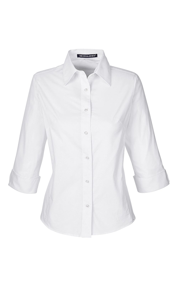 Fabric: 3.7 oz., 97% cotton, 3% spandex. Features: Classic feminine shape for a flattering fit. Fine stitching throughout. Delicate, pearlized buttons on front placket. Back yoke. Princess seams. Bust darts; Three-quarter sleeves with fold-up cuff detail.