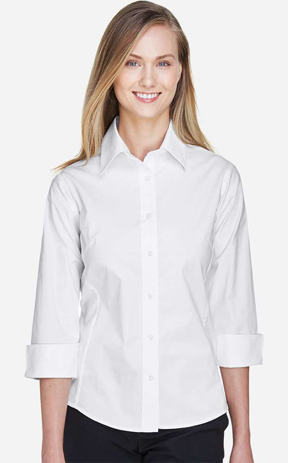 Fabric: 3.7 oz., 97% cotton, 3% spandex. Features: Classic feminine shape for a flattering fit. Fine stitching throughout. Delicate, pearlized buttons on front placket. Back yoke. Princess seams. Bust darts; Three-quarter sleeves with fold-up cuff detail.