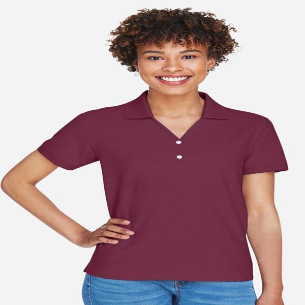 Fabric: 6.8 oz., 100% Peruvian pima cotton. Comfort of luxurious pima cotton. Grey Heather is 90% cotton, 10% polyester. Features: Dura-Pearl buttons. Rib knit cuffs. Feminine fit. Delicate Y-collar. Two-button placket.