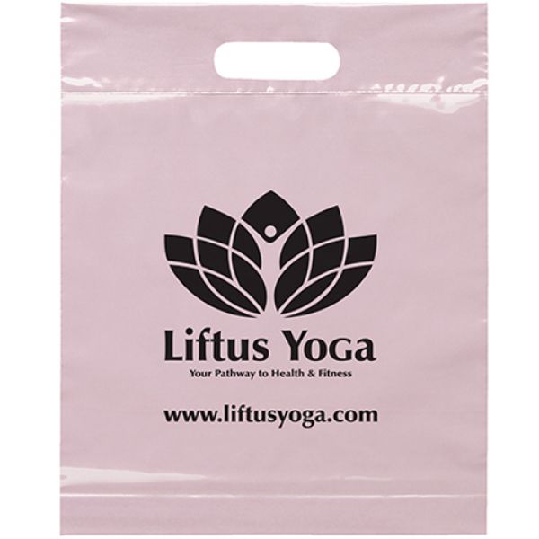 This low-density 2.5 mil plastic bag with fold-over reinforced die cut handles is a perennial customer favorite for good reason: simplicity, functionality, and durability. USA made. Price includes one color, one location imprint.