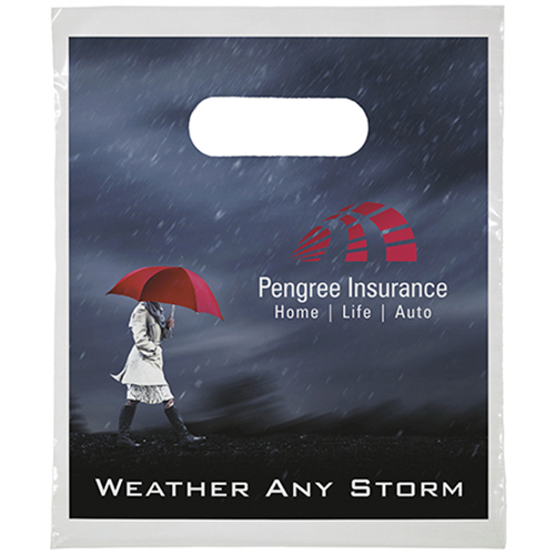 Our Digital Full-Color Die Cuts offer 2-sided imprints, crisp colors, generous imprint area, and exceptional clarity for small fonts, fine lines, and details. These 2.0 mil plastic bags have non-reinforced die cut handles and are available in multiple sizes. Price includes full color imprint.