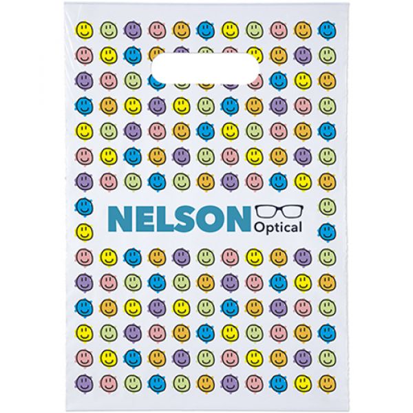 Our Digital Full-Color Die Cuts offer 2-sided imprints, crisp colors, generous imprint area, and exceptional clarity for small fonts, fine lines, and details. These 2.0 mil plastic bags have non-reinforced die cut handles and are available in multiple sizes. Price includes full color imprint.