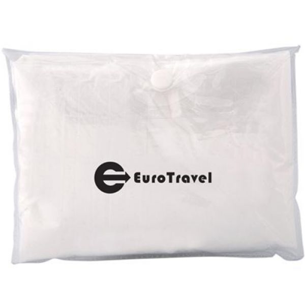 Plastic poncho with PVC pouch. Disposable poncho with hood. Folds into included carry pouch. One size fits most. Never get caught in the rain again. Keep handy in your vehicle. Not for use by children; suffocation hazard. For travel, outdoor activities and sporting events. 6.5" W x 4.5" H (pouch). Price includes one colour, one location imprint.