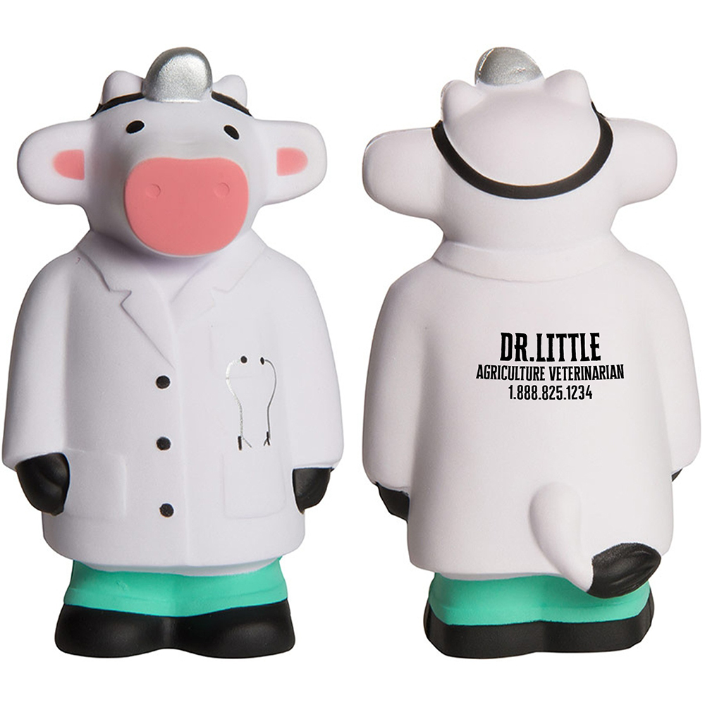 Custom stress ball - 2.5" x 4.25"- 0.1 lbs. Shaped like a cow dressed like a doctor. Imprint dimensions: 1" x 1". Price includes one colour imprint. Free art proof will be emailed with every order within one business day. In white colour. A minimum of 150 personalized stress balls in 7 days of production. No hidden fees!