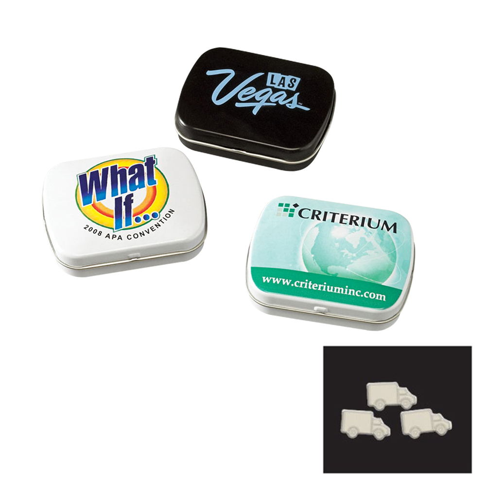 Domed Tin with Truck Shaped Mints. Price includes full color imprint.