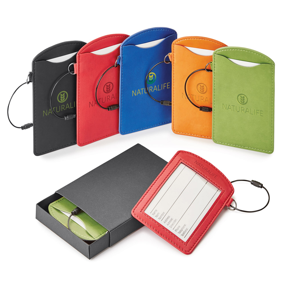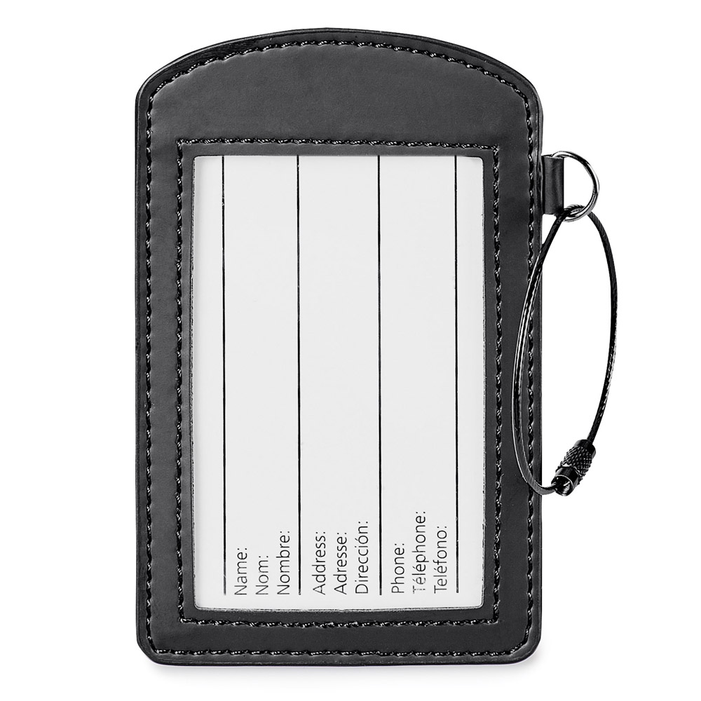Standard: 2-piece black gift box. Enter our stylish Donald vinyl luggage tag with its wide window display and secure black metal wire closure. Bonus: it is sized to fit a standard business card which makes it the perfect luggage companion! Price includes debossing.