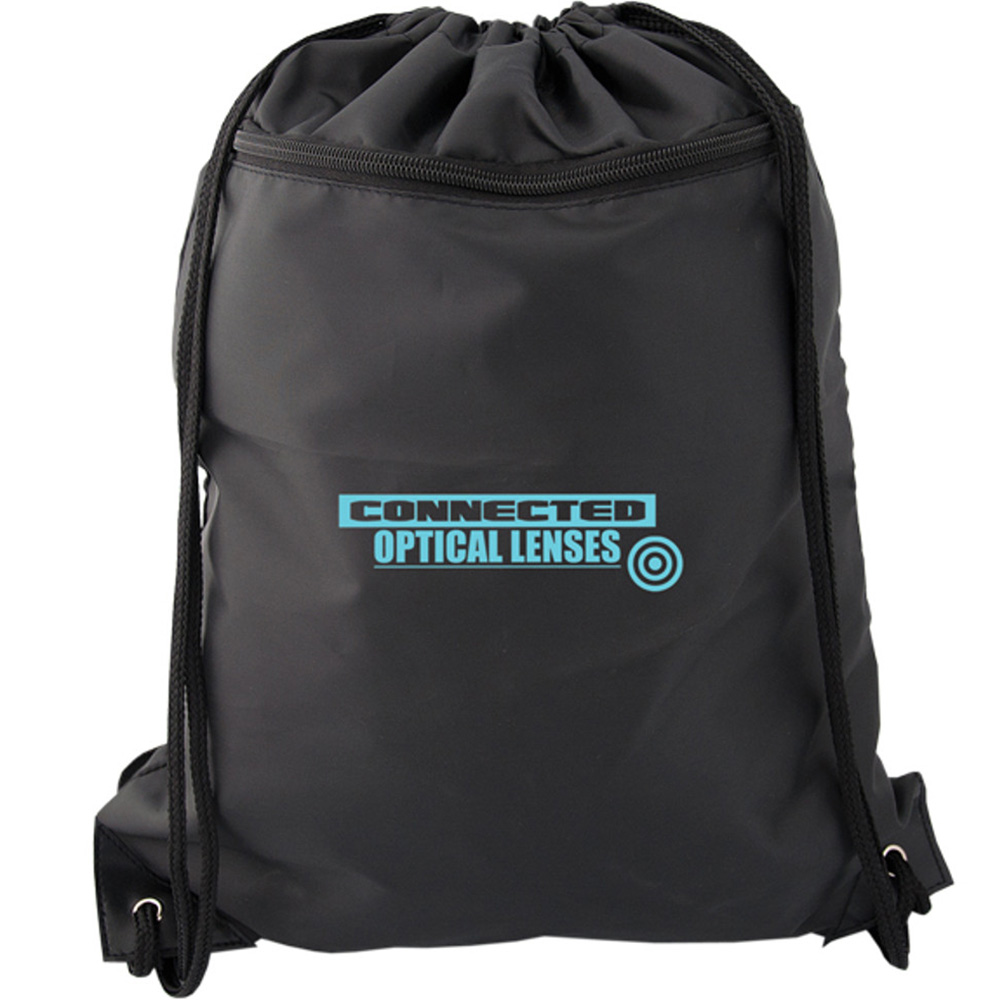 210D Polyester. Black double cords that act as drawstring closure and straps for backpack. Large front zippered pocket. Black rubber reinforced bottom corners around silver metal grommets. Price includes one colour, one location imprint.