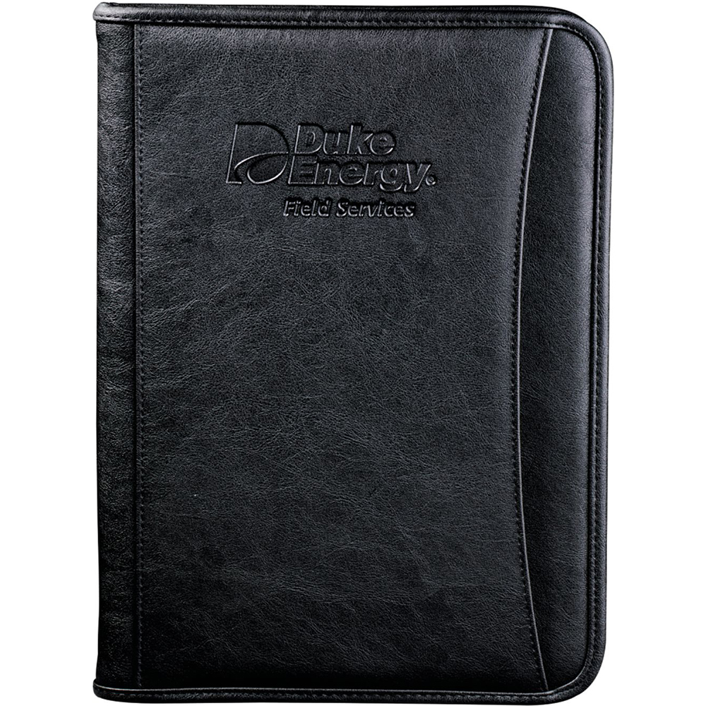 The premium DuraHyde Zippered Padfolio features an interior organizer with gusseted file pocket. This zippered closure padfolio includes Clear ID or calculator pocket and front slot pocket. The DuraHyde Zippered Padfolio includes a 8.5" x 11" writing pad. Refills available leedsworldrefill. Refill item number: 9091-01. Pen not included. Zippered closure. Interior organizer. Gusseted file pocket, Clear ID or calculator pocket. Front slot pocket. 8.5" x 11" writing pad. Refills available at leedsworldrefill. Price includes debossing.