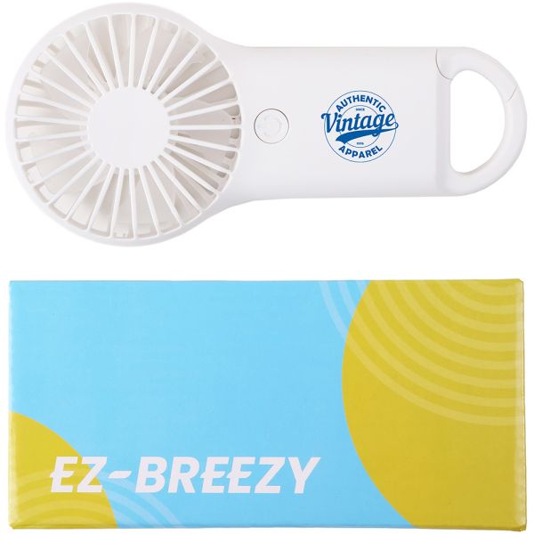Pack a punch with the E-Z Breezy Mini Travel Fan. This lightweight and portable fan blows a good amount of air for its modest size. The compact design makes it easy to take on the go. Whether at the office, on a plane, or just relaxing at home, this little fan will make a difference in helping anyone stay cool and comfortable. Don't let the heat get them down. Let your brand be their perfect travel partner. Comes with 3 AAA batteries. Packaged in a decorated box. Fan has two adjustable speeds. Portable handheld fan made of plastic with easy to operate front power button. Easy to operate front power button. Carabiner design allows you to hang on bags, pockets, and more. Comes with 3 AAA batteries. Packaged in a decorated box. Two adjustable speeds. Material: