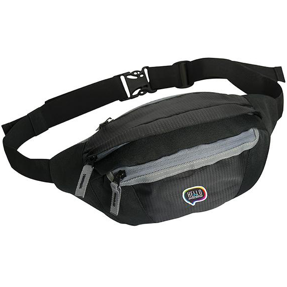 600D Ripstop PU. Three zippered compartments. Front pocket. Main compartment. Back zippered pocket. Padded air mesh backing. Adjustable/non-detachable strap fits up 44". Large capacity for extra hands free storage. Price includes one colour, one location imprint.