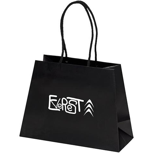 Give your packaging an upscale look with this uniquely-shaped, premium-weight matte laminated bag. Features 16" matching macramé handles, reinforced fold-over top, and cardboard bottom insert. 7 3/4TW x 10BW x 7 1/2H x 4BG. Price includes foil stamp.