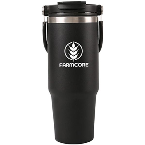 3.5" Diameter x 9.5" H. Stainless Steel travel tumbler with powder-coated exterior. Crafted from 304 Stainless Steel inside and 201 Stainless Steel outside. Robust flip-up carry handle and drinking straw. Silicone plugged sipping hole revealed from flip up flap. Double walled travel tumbler. Holds up to 30 fl. oz. (900 ml.). Featuring an Ugly Beautiful Box: We've removed the unnecessary and kept it basic. No lamination, no full colour. ink, no bleach or dye. It might be ugly, but it has a beautiful purpose: one small win for the planet! Max rush production is 500 pieces. Price includes one colour, one location imprint.