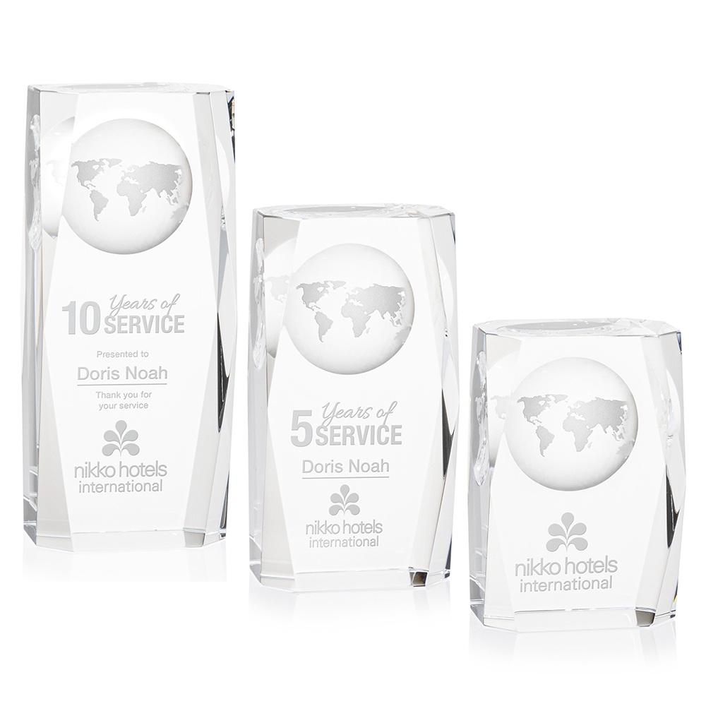 Optical Crystal. Features a 3D world Globe molded into the back of the award. 3 sizes. Price includes laser engraving.