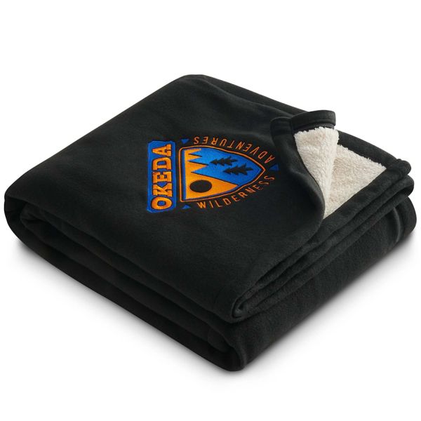 Polar fleece on one side and soft sherpa on the other. Snuggling up in this blanket will keep you extra warm on the chilliest winter nights. Free run charges for embroidery up to 7500 stitches. The open dimensions are 60" x 50" and folded dimensions are 14.5" x 12". Material: Polyester Fleece. Price includes embroidery up to 10000 stitches.