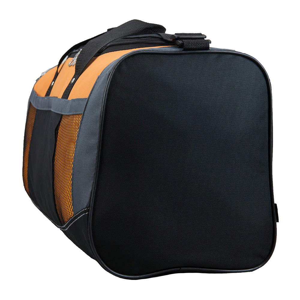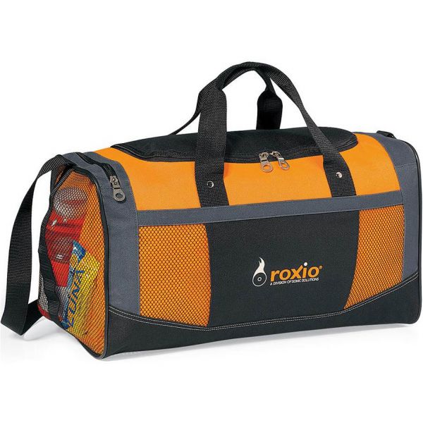 Sporty gym Custom Duffel Bags with front mesh and side mesh pockets for various essentials. With removable floor board. Minimum order of 50 pcs. 3 days rush production. 4 colour options available. Embroidery and screen print method. Free art proof. Product area 10.75" x 9.5" x 19" - 1.07 lbs. Stylish Promotional Duffel Bag has adjustable, non-removable shoulder strap and top grab handles. Price includes 1 colour imprint, one location. Made of 600d polyester material. Imprint measures 7" x 4". Each bag has Black back panel. rushIMPRINT it!