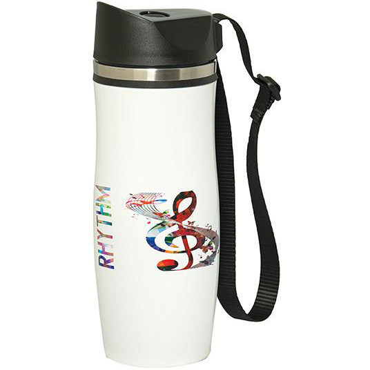 18/8 Stainless Steel exterior with 18/0 Stainless Steel interior. Double walled with vacuum insulated. Black Silicone ring. Holds up to 400 ml. (13.5 oz.). Individually boxed. FDA compliant and BPA free PP twist on/off lid. Webbed adjustable carry handle/strap. Push button open/close lid. Leak proof. Price includes one colour, one location imprint.