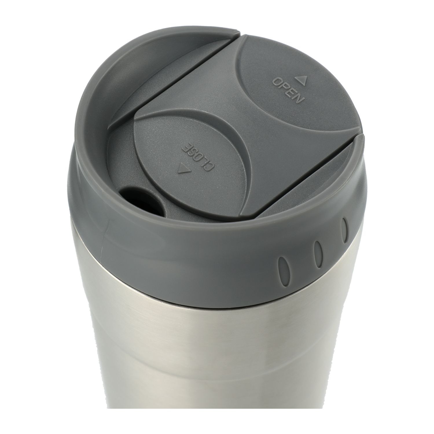 The Frenchie Tumbler 17oz has a colorful design that's as functional as it is stylish. It includes a push-on lid with a thumb-slide that matches the tumbler's color. This BPA-free 17oz tumbler features double-wall stainless steel construction and has a stainless steel liner to help keep your beverages fresh.
