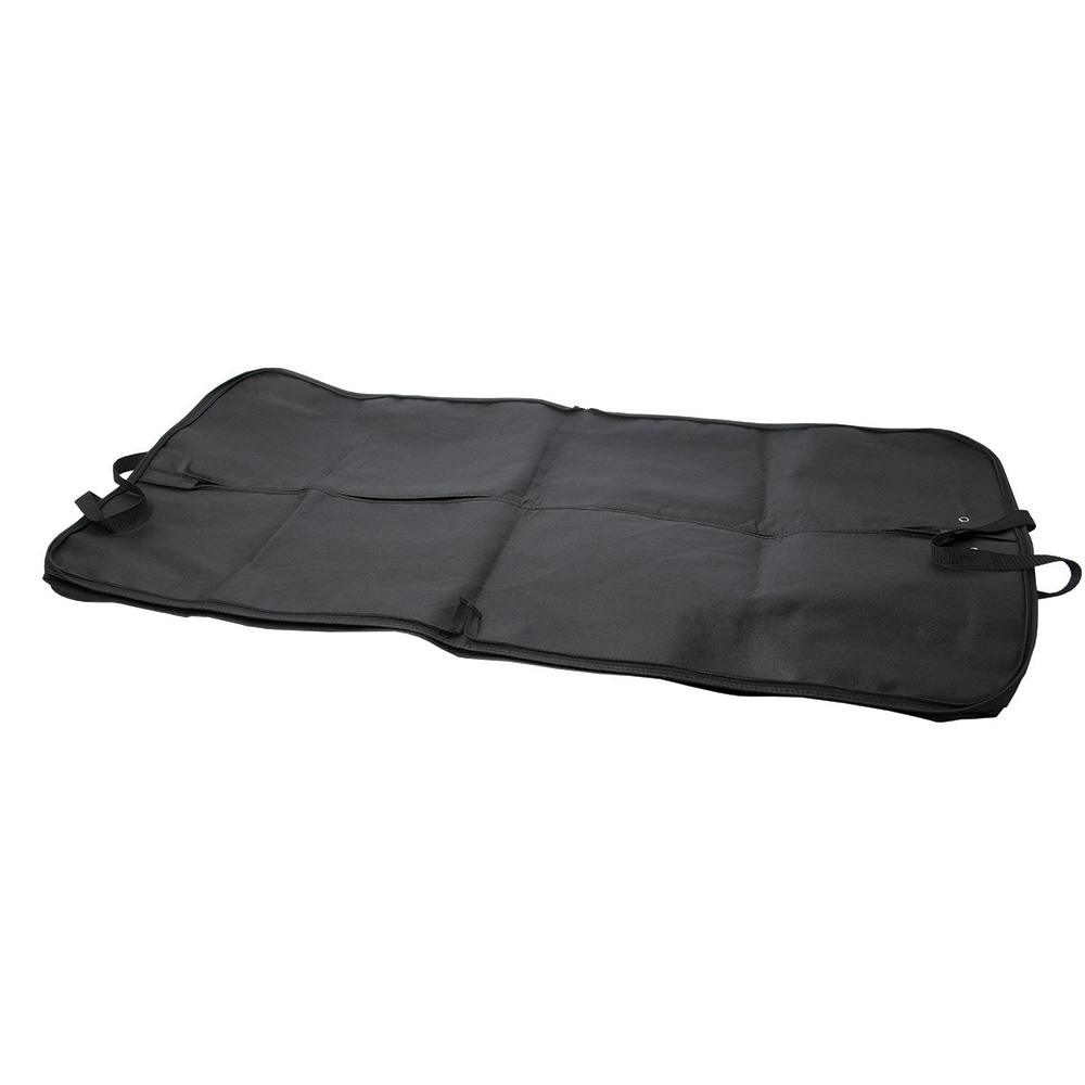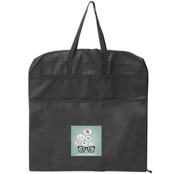 Non woven 90 gram Polypropylene. Full-length zippered closure. Two webbed carry handles. Front zippered pocket. Hanger hole with loop. Protect your clothes and keep them wrinkle-free. A great promotional item for clothing stores, travel agencies and dry cleaners. Price includes one colour imprint, one location on the front zippered pocket.