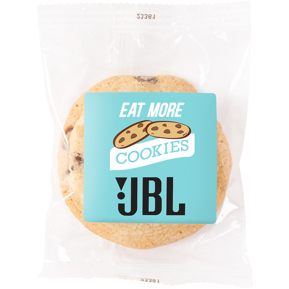 Crunchy, buttery, Chocolate Chip Cookie is ideal for tradeshows, employee recognition, mug stuffers, gift baskets & more! Always Fresh & Individually Wrapped. Custom Color Full Color Digital Label. Non-Melt. 6 Month Shelf Life. Price includes full colour imprint.