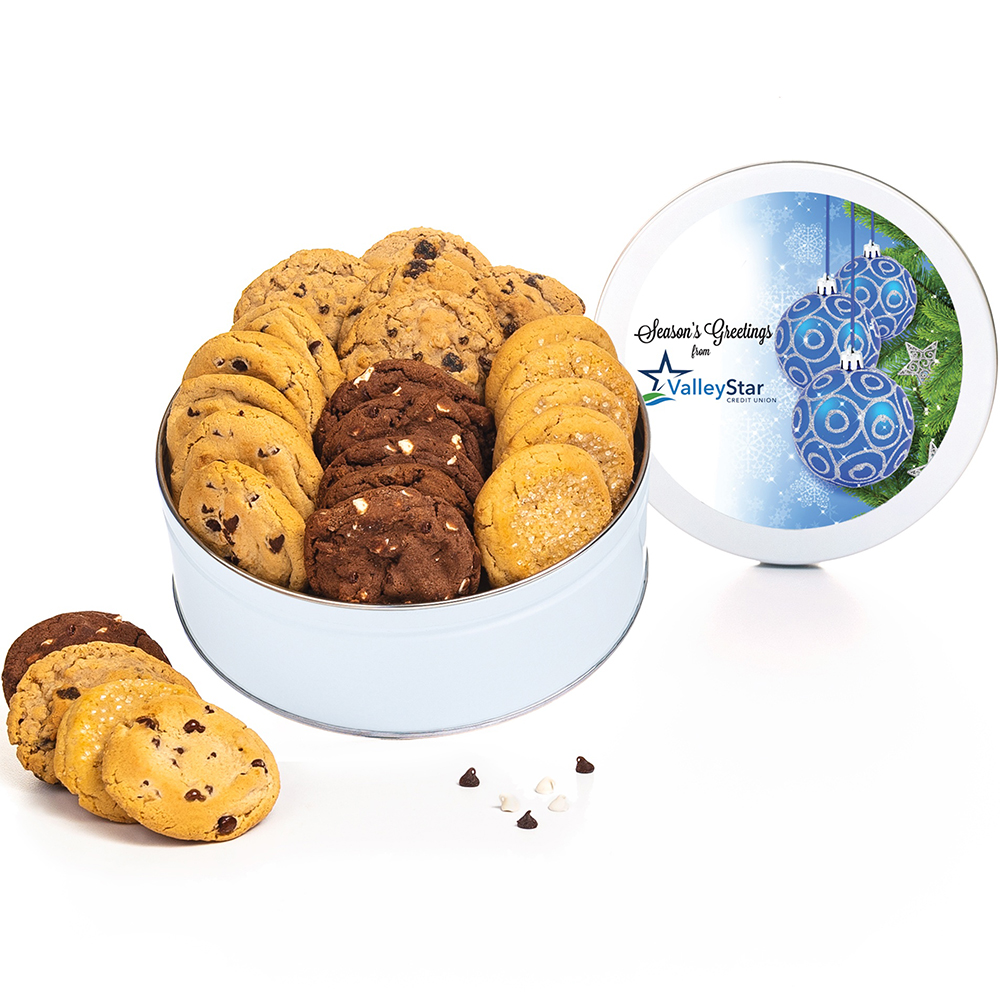 We've taken four of our most popular Classic Cookies and created a special assortment that everyone will enjoy. Tin comes complete with 18 individually wrapped cookies. Cookies are non-melt and have a 3 month shelf life. Price includes full color imprint on lid. Assortment includes: 5 Gourmet Chocolate Chip Cookies. 4 Oatmeal Raisin Cookies. 4 Chocolate Double Chip Cookies. 5 Crystal Sugar Cookies. Price includes full colour imprint.