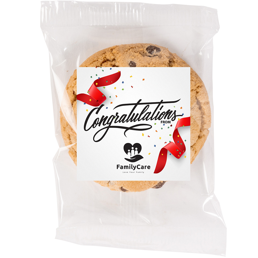 Our best selling fresh-baked gourmet chocolate chip cookie is ideal for tradeshows, employee recognition, mug stuffers, hotel turndowns, gift baskets and more! Cookies come individually wrapped for easy sharing and freshness! Comes complete with a custom full color digital label. Cookies are non-melt and have a 3 month shelf life. Price includes full colour imprint.