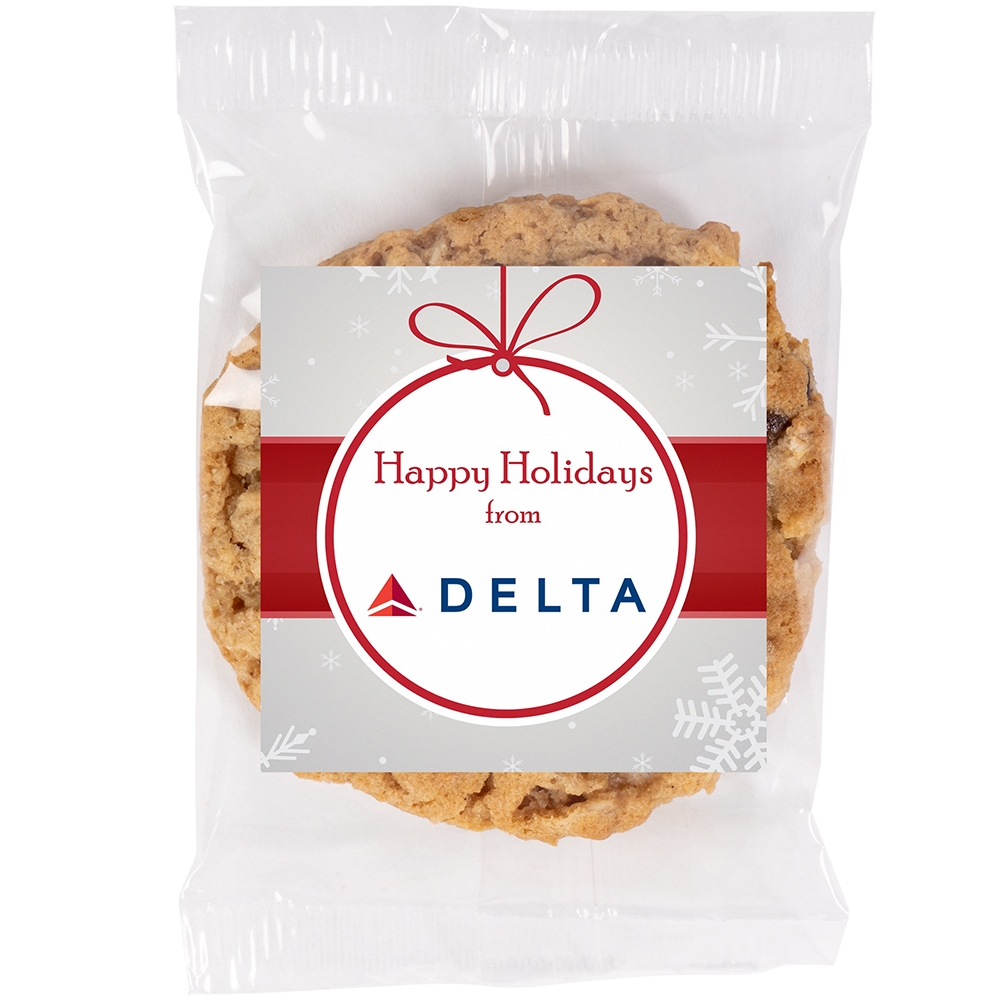 Fresh-baked gourmet cookie is ideal for tradeshows, employee recognition, mug stuffers, hotel turndowns, gift baskets and more! Cookies come individually wrapped for easy sharing and freshness. Cookies are non-melt and have a 3 month shelf life. Price includes full colour imprint.