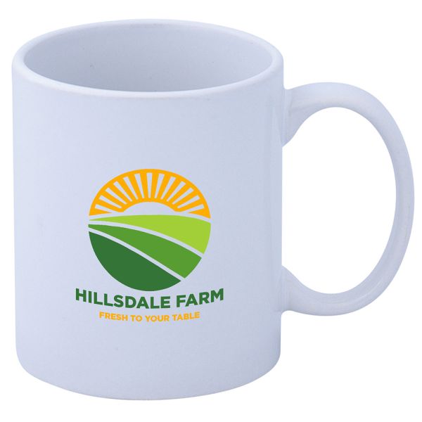 Ceramic. Glossy interior and exterior. Holds up to 325 ml. (11 oz.). Make the most out of your marketing dollars!. Large, ergonomic C' handle. Bulk packed. BPA free (Bisphenol A) and FDA Compliant. Dishwasher safe. Microwave safe. Price includes one colour, one location imprint.