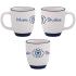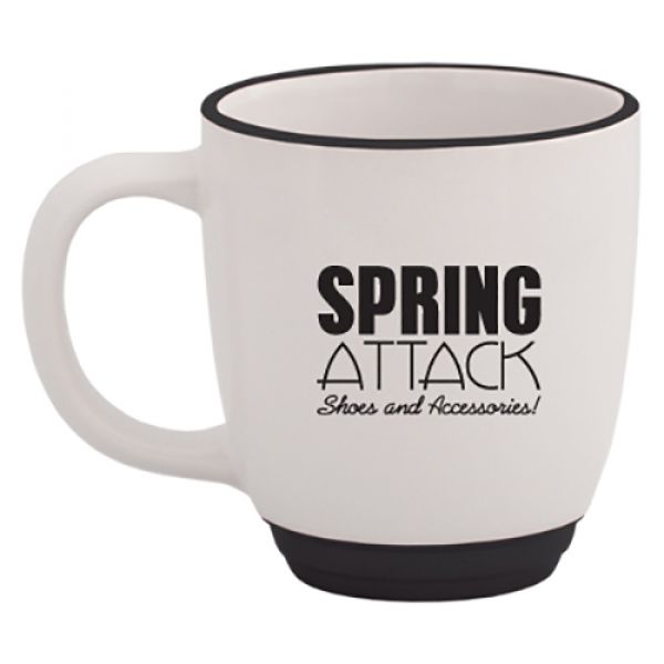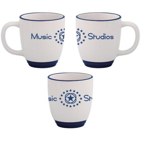 Ceramic. Holds up to 385 ml (13 oz.). Matching coloured rim and base. Sturdy D' shaped handle. Bulk packed. Dishwasher safe. BPA free (Bisphenol A) and FDA Compliant. Microwave safe. Price includes one colour, one location imprint.