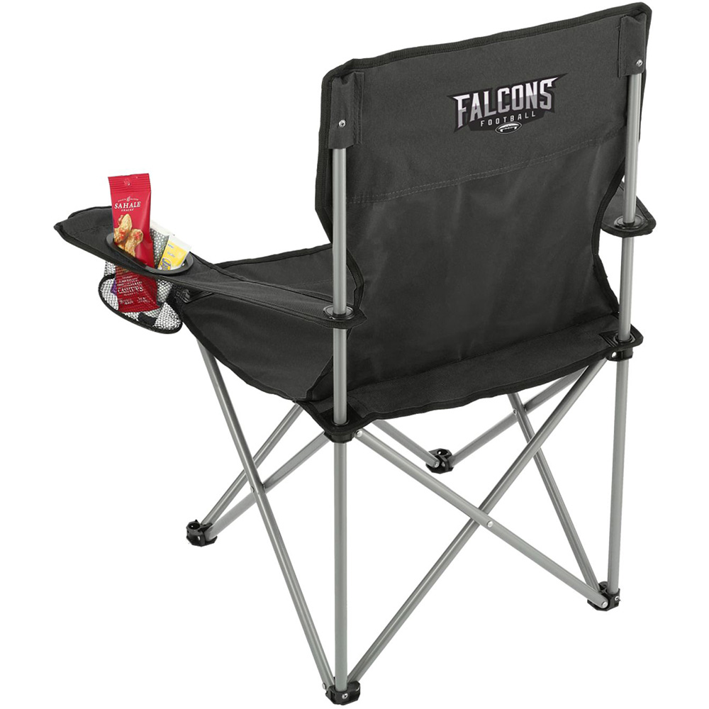 The Game Day Event Chair features armrests with built-in cup holders. This PolyCanvas outdoor chair folds up and fits into its included carrying case with strap for easy transporting and storage. Chair is shipped outside of its carrying case. Loading weight limit: 300lbs. Material: 600d polycanvas. Chair folds into included carrying case. Carry case has shoulder strap for easy transporting. 300lb capacity. Price includes one color, one location imprint.
