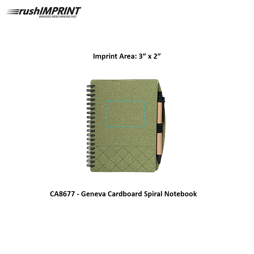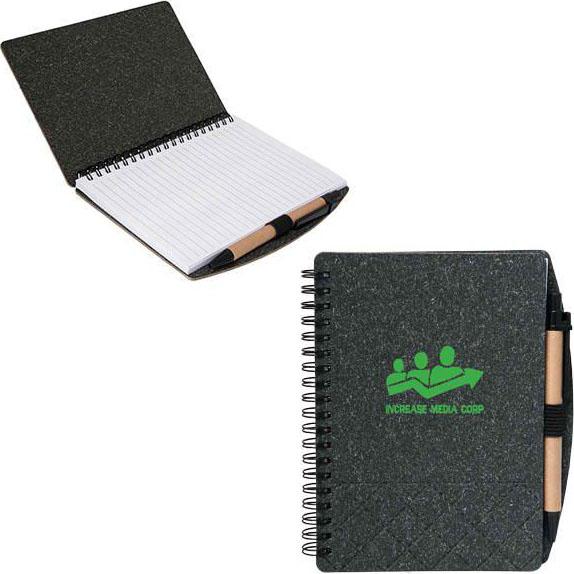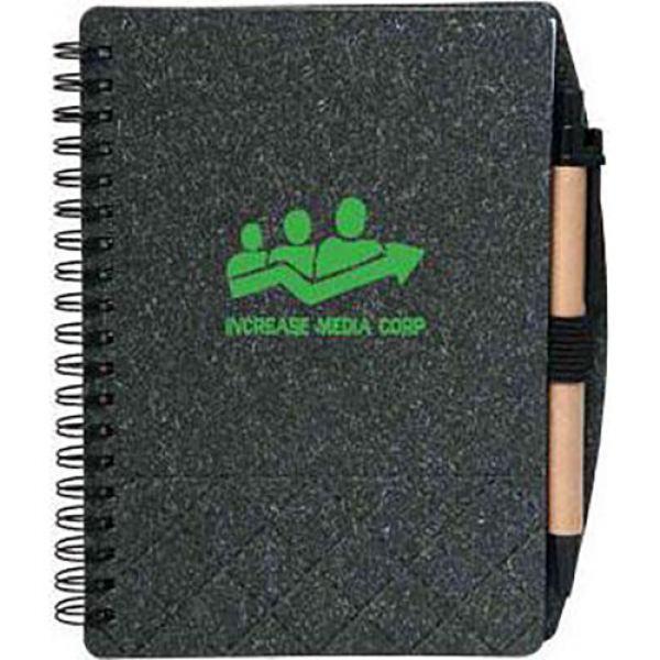 Cardboard. Cover has a speckled marble-like appearance. Spiral binding. Includes 70 sheets of lined 70 gram paper. Elastic pen loop. Includes PE4772 natural/black pen with blue ink. Diamond quilted pattern along bottom third of the cover. No extra charge to insert your own pen, click on 'Decorating info' for more information. Price includes one colour, one location imprint.