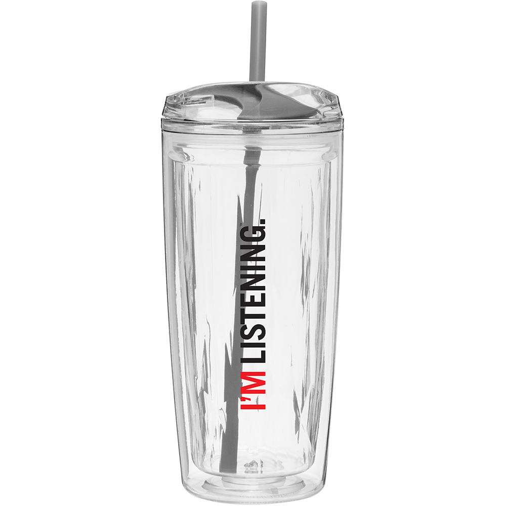 16 oz double wall acrylic tumbler with clear outer wall, colored geometric inner wall, push-on dual-purpose swivel lid, and matching soft straw