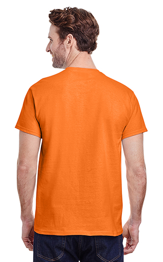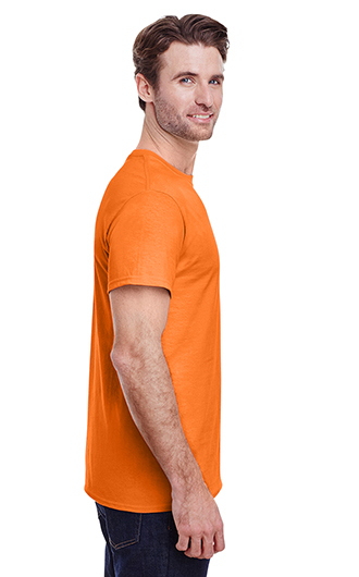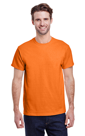Screen Print, Fabric: 100% preshrunk cotton. Antique (Cherry Red, Jade Dome, Irish Green, Sapphire, Orange) and Sport Grey are 90% cotton, 10% polyester. Sunset, Safety Pink, Russet, Neon (Green, Blue), Midnight, Lilac, Blackberry, Tweed, Safety Green, S. Orange, Dark Heather, Graphite Heather, and Heather (Military Green, Radiant Orchid, Red, Sapphire) are 50% cotton, 50% polyester. Ash Grey is 99% cotton, 1% polyester. Features: Seamless rib at neck. Taped shoulder-to-shoulder. Double-needle stitching throughout. Tear-away label. Safety Green is compliant with ANSI /ISEA 107 high visibility standards. Quarter-turned to eliminate center crease. 7/8" collar. Classic fit. Price includes a one color imprint on left chest.