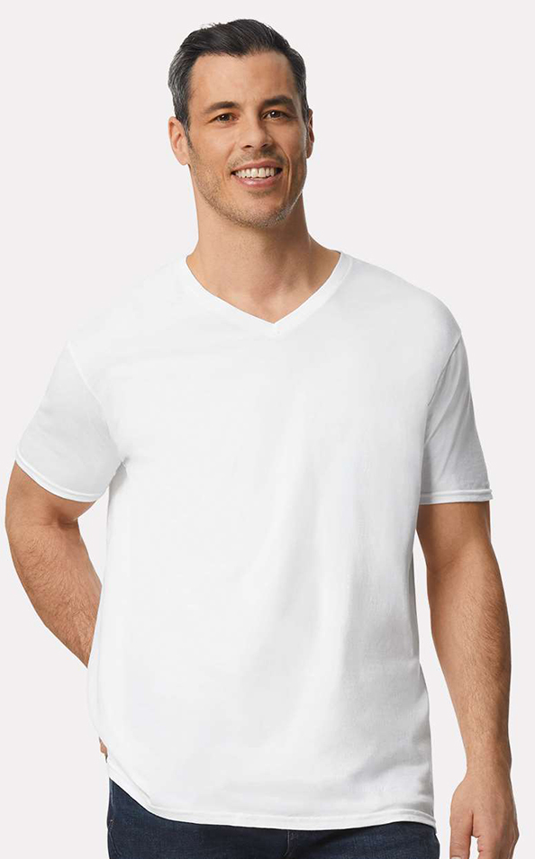 Screen Print, Features: 100% preshrunk cotton. Deluxe 30 singles Softstyle yarns. Mitered V-neck. Double-needle stitched sleeves and bottom hem. Sport Grey is 90/10; Dark Heather, Heather (Irish Green & Purple) are 65/35. Seamless double-needle collar. Taped neck and shoulders.