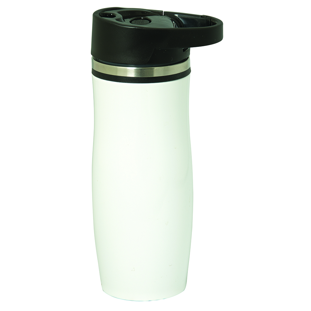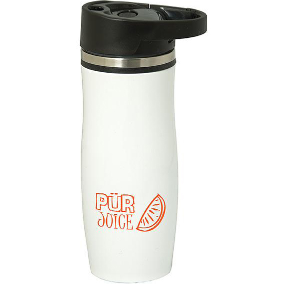 18/8 Stainless Steel exterior with 18/0 Stainless Steel interior. Double walled with vacuum insulated. Black Silicone ring. Holds up to 400 ml. (13.5 oz.). Individually boxed. FDA compliant and BPA free. PP twist on/off lid. Push button open/close lid. Leak proof. Carabiner carry handle. Price includes one colour, one location imprint.