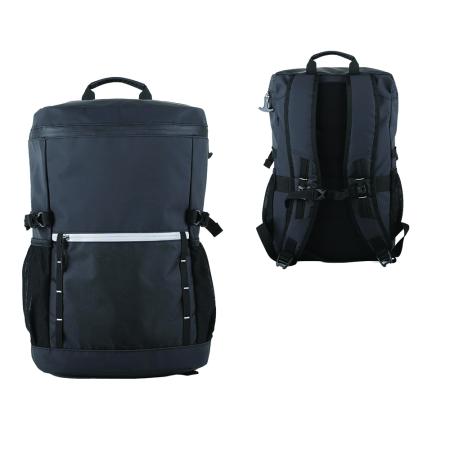 0.55mm Tarpaulin body material and Polyester 840D/PVC pocket material. 210D Polyester lining. 19 L capacity. Mesh pocket inside of lid. Single main compartment with laptop sleeve, zippered mesh pocket, phone pocket and a RFID pocket. Reflective strips along front zippered pocket. Bottle mesh pockets on both sides. Water resistant fabric and zipper. Chest buckle included for better support. Can attach over trolly handle. Packaged in an individual open poly bag. Price includes one colour, one location imprint.