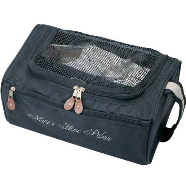 600D Polyester. Three-sided zippered mesh compartment for ventilation. Leatherette zipper pull tabs and attractive gold zipper pulleys. Full-length zippered compartment for golf glove, tees. Attractive two-toned ribbed webbed handle. Price includes one colour imprint, one location.