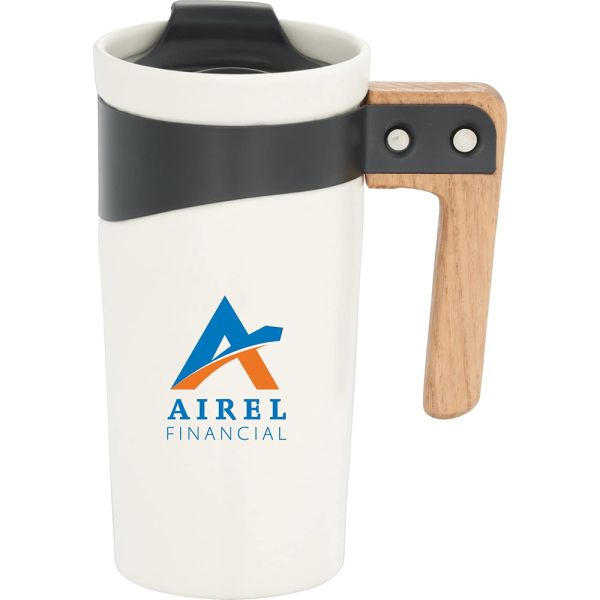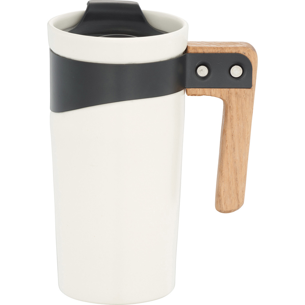 A must-have ceramic tumbler. Matte finish body and natural wooden handle are combined by the black coated stainless steel band. Push-on, slide lock lid included. Up to 3 logo decoration spots are available. Leed's Exclusive. 16 oz. Material: Ceramic. Price includes one color, one location imprint.
